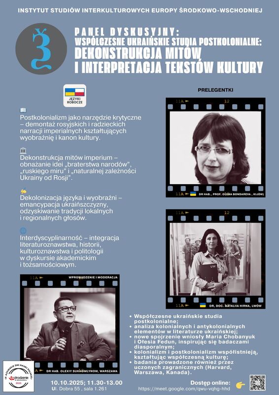 Panel dyskusyjny „Współczesne ukraińskie studia postkolonialne: dekonstrukcja mitów i interpretacja tekstów kultury” odbędzie się 10 października 2025 roku w godzinach 11:30–12:00 w Instytucie Studiów Interkulturowych Europy Środkowo-Wschodniej Uniwersytetu Warszawskiego, przy ul. Dobrej 55, sala 1.261.